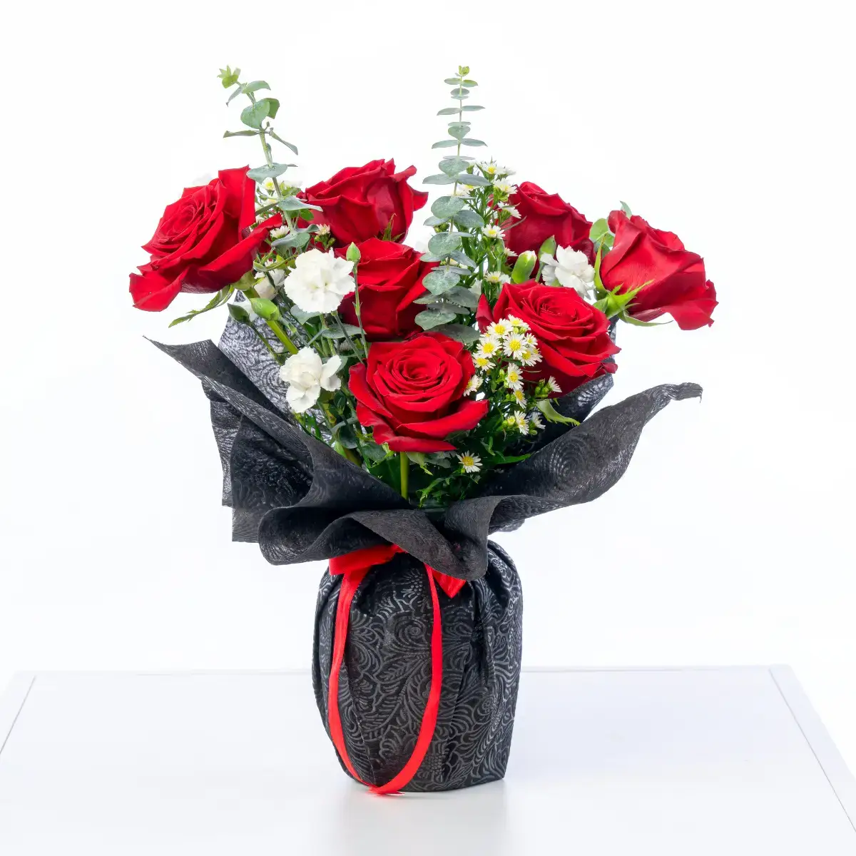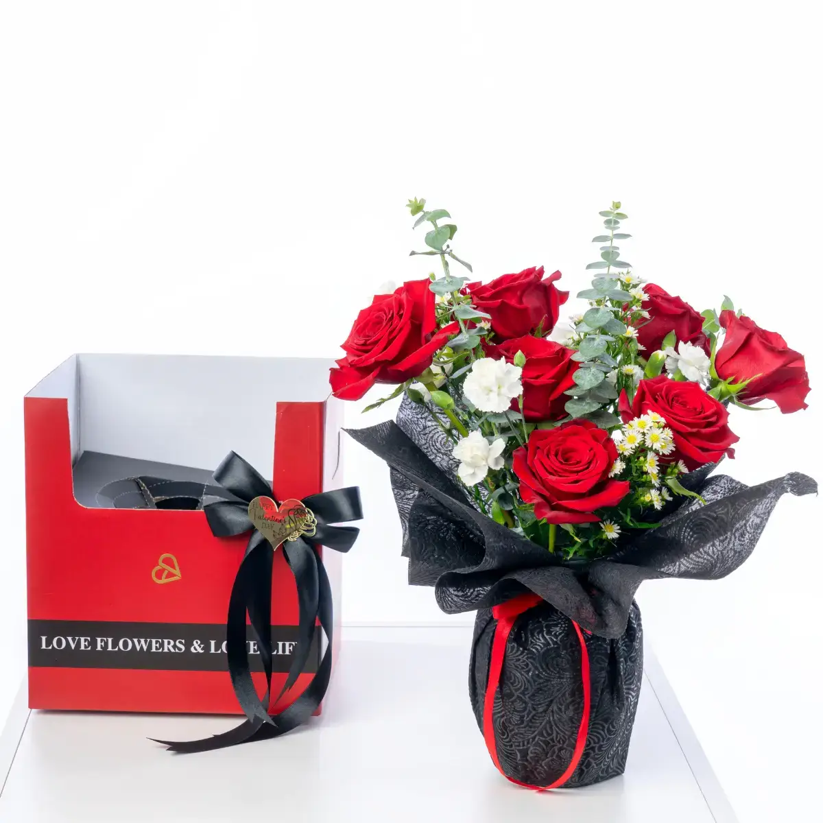 A romantic and delicate arrangement designed to impress: 8 red roses, eucalyptus, mini carnations, mini stock, and daisy-like filler flowers, beautifully presented in a glass vase and paired with an elegant gift box for easy transport. A premium Valentine’s Day gift that speaks from the heart.